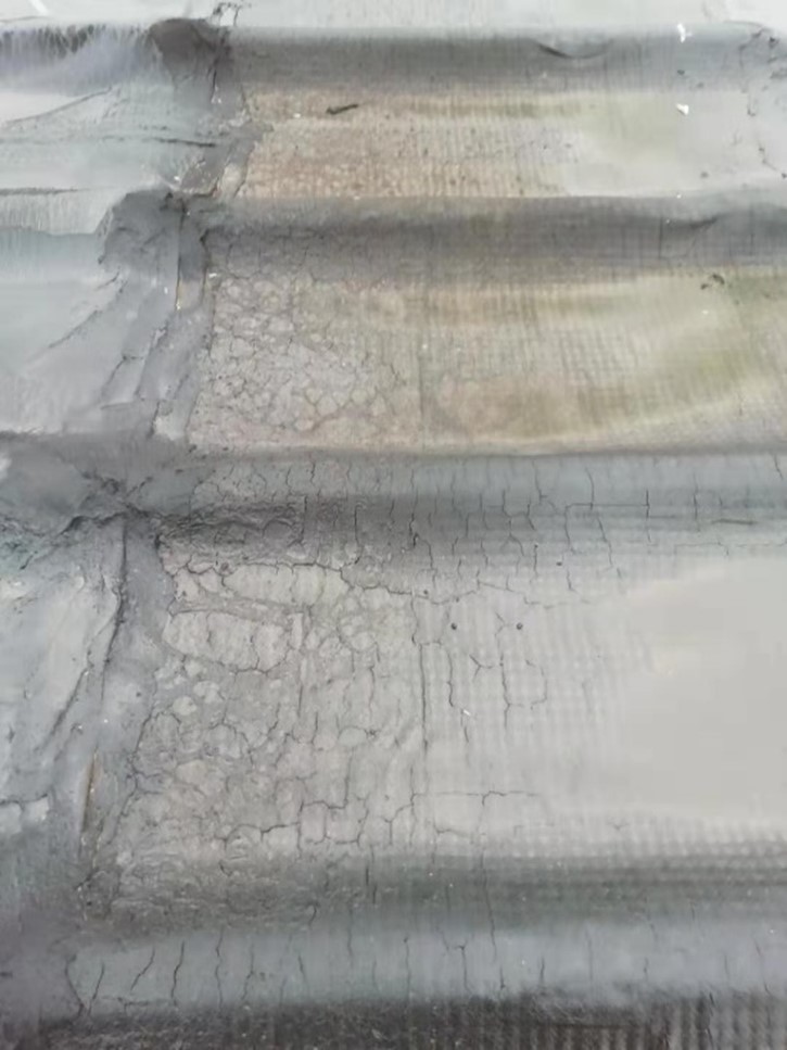 ③自粘卷材鋪貼施工(彩鋼頂裸露屋面耐久性不是很好,并且在立面或者水溝內(nèi),太陽暴曬出現(xiàn)自粘卷材滑落流淌垮在地面堆積情況較為嚴(yán)重,導(dǎo)致施工的自粘卷材防水失效。自粘卷材表面粘結(jié)面所使用的粘接劑如果不合格,過不了多久之后粘接劑失效,卷材粘結(jié)面也會(huì)起層脫落);并且自粘卷材粘結(jié)面使用的粘合劑,粘合劑在露天環(huán)境中會(huì)老化,到時(shí)粘結(jié)力就會(huì)下降,自粘卷材會(huì)脫層。