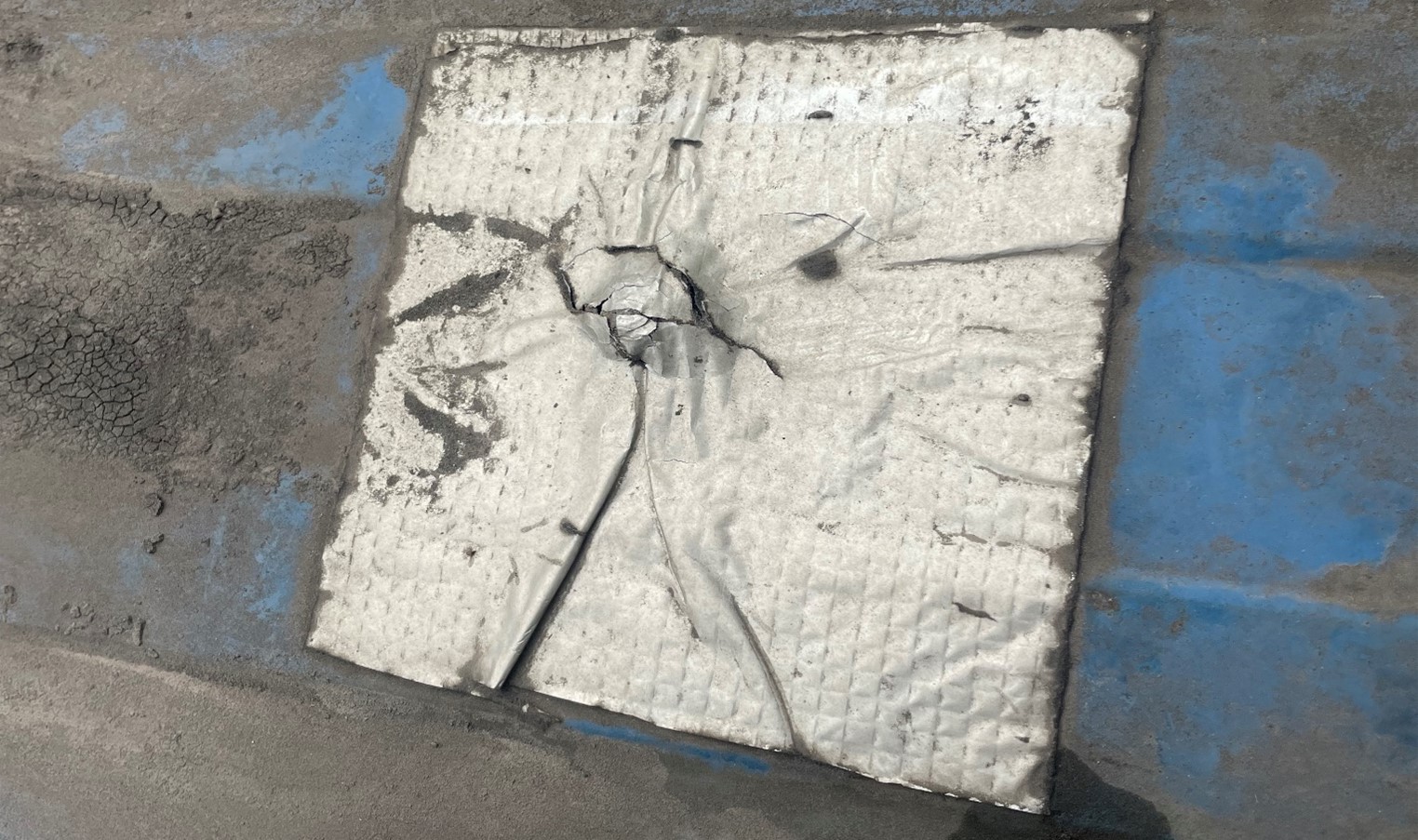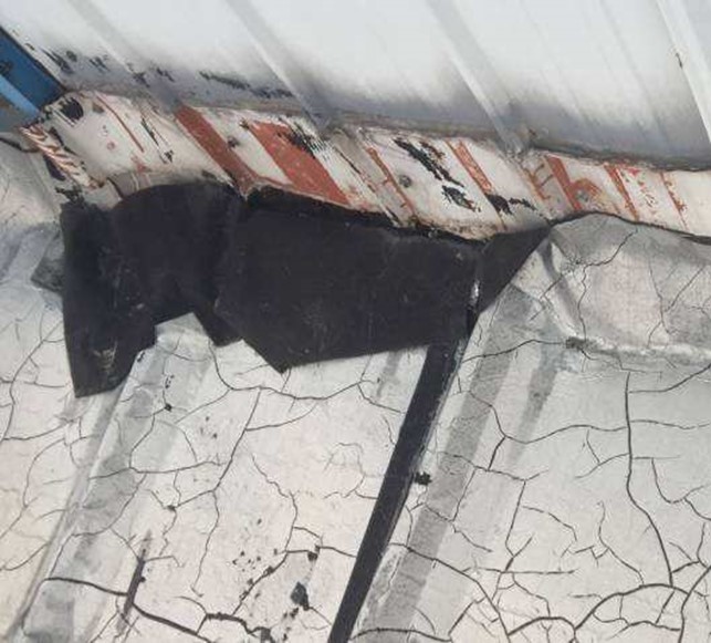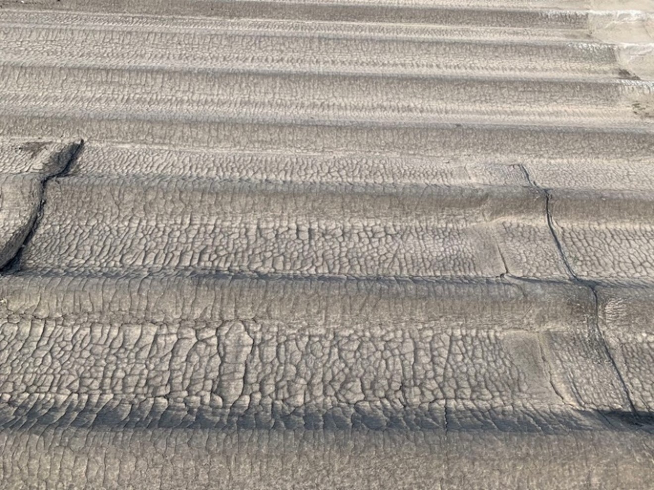 ①針對彩鋼瓦屋面防水,市面上很多人采用的SBS改性瀝青防水卷材施工處理,但是SBS改性瀝青防水卷材是非外露材料,是不能裸露使用的,這彩鋼頂表面由于夏季溫度比混凝土溫度還高,所以改性瀝青防水卷材做在彩鋼瓦表面基本兩三年后就會被曬得開裂,以下照片可以看出彩鋼瓦表面瀝青防水卷材很快就老化開裂。