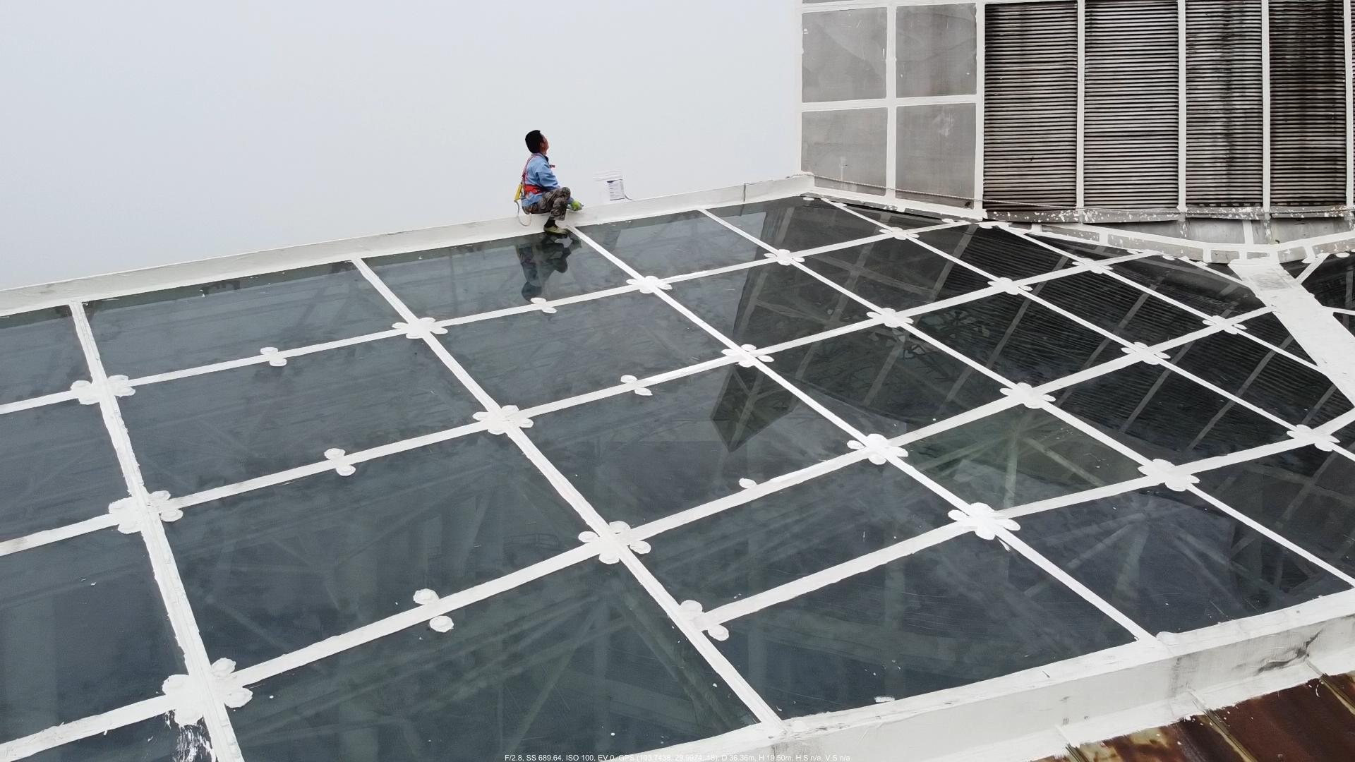 我公司采取的施工方法是,采用SYR金屬屋面專用防水涂料配合我們的專用縫織聚酯布,先將玻璃頂表面清理干凈,然后涂刷一遍防水涂料、鋪貼專用聚酯布、再涂刷第二遍防水涂料,待干后再涂刷一遍防水涂料,最終將施工工作面清理干凈。