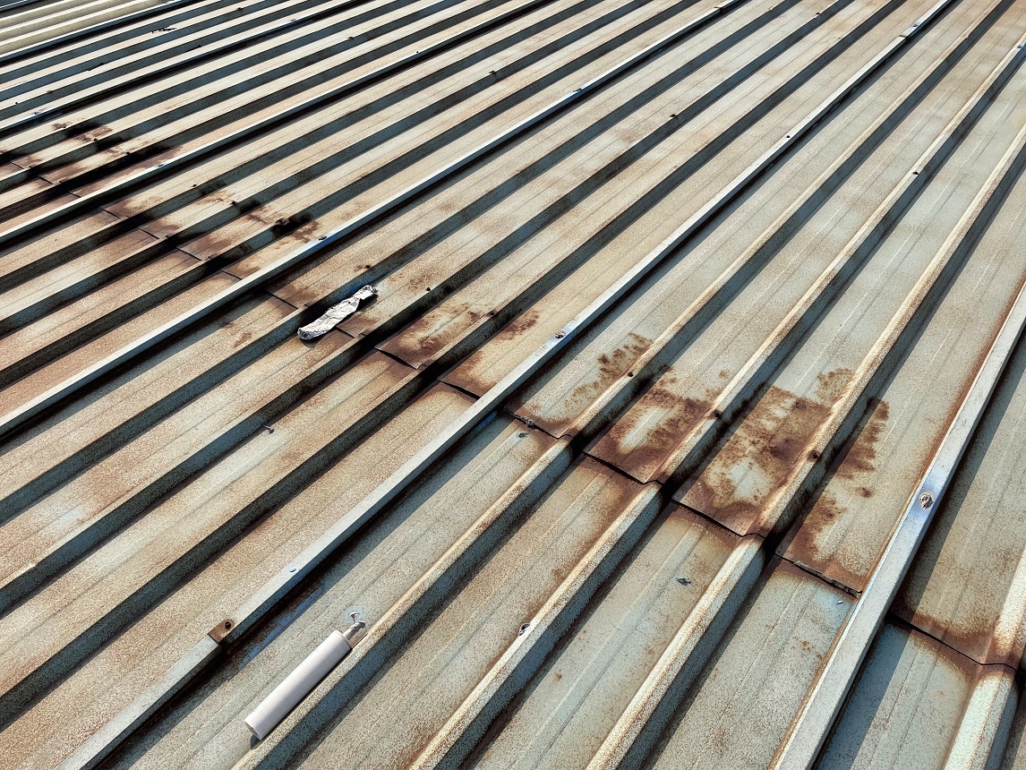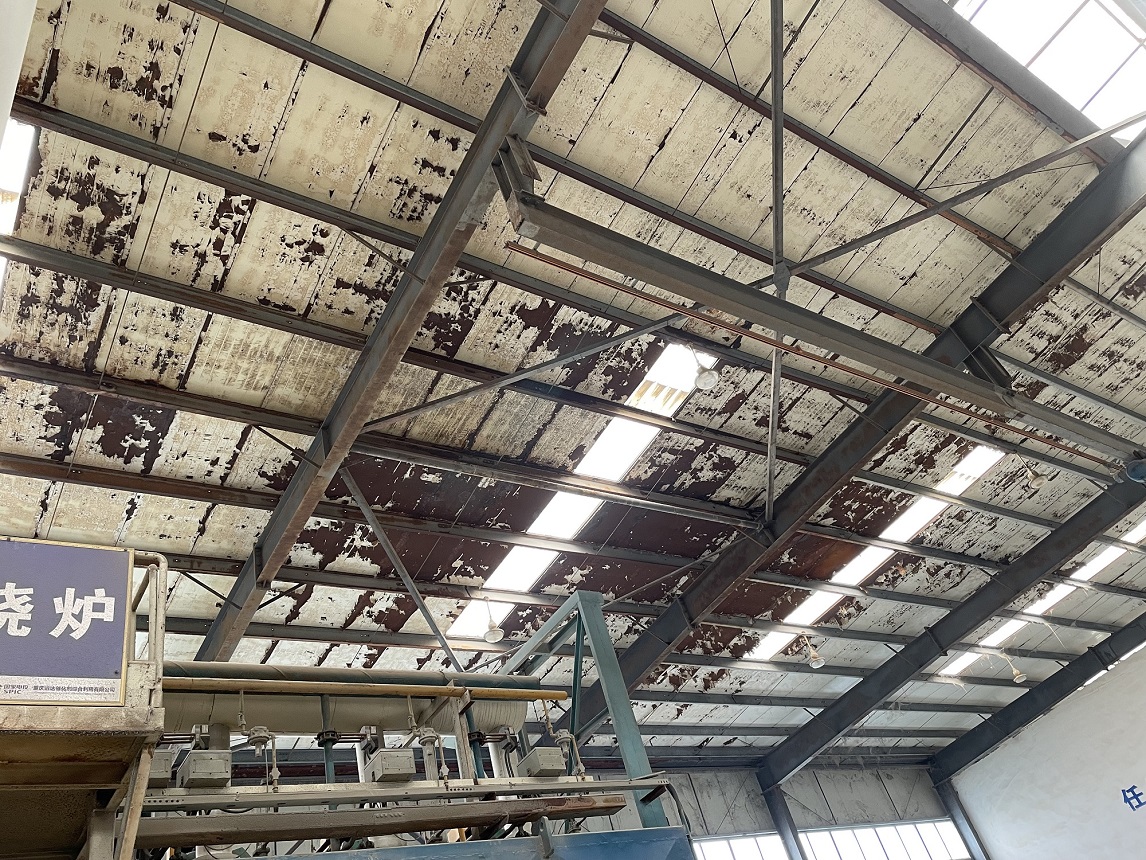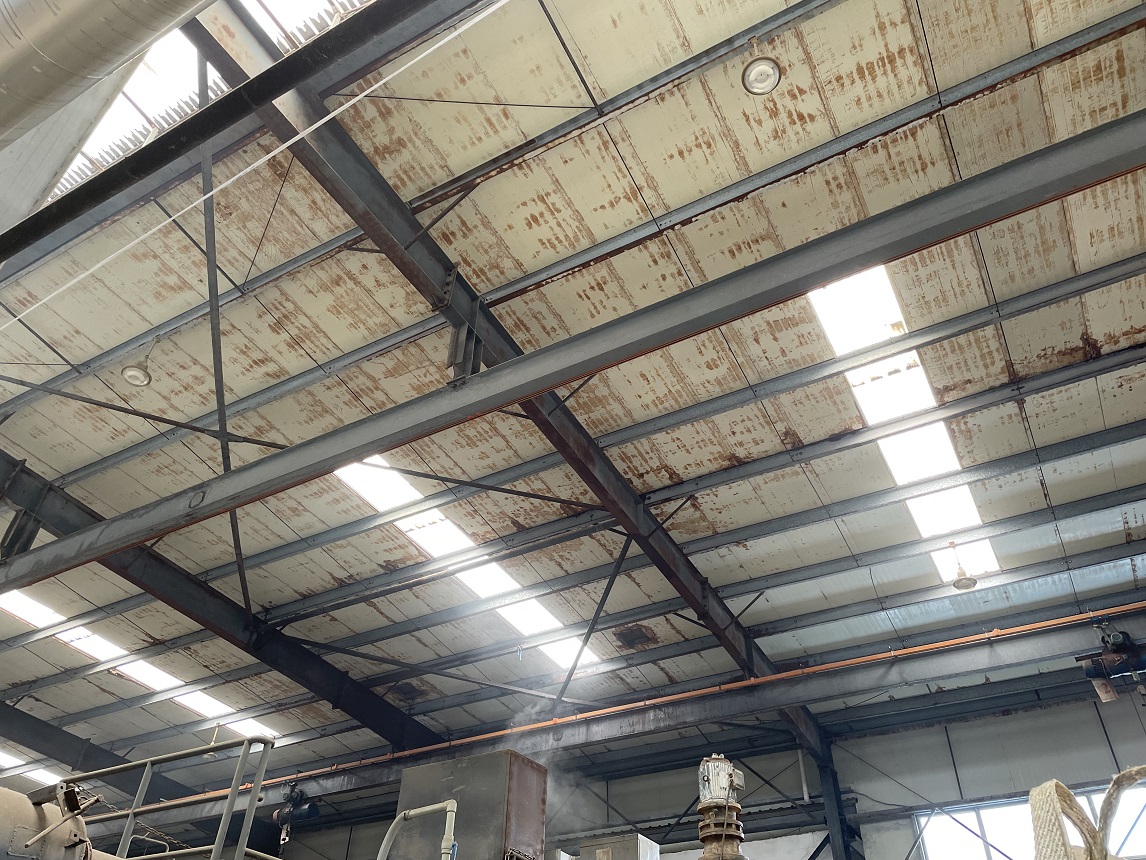 我公司2021年9月施工的位于重慶市潼南區(qū)田家工業(yè)園的重慶遠達催化劑綜合利用有限公司彩鋼頂防水,此廠房內(nèi)為生產(chǎn)催化的車間,氣體具有一定的腐蝕性,導致廠房的彩鋼頂出現(xiàn)了一些銹蝕,彩鋼頂銹蝕情況: