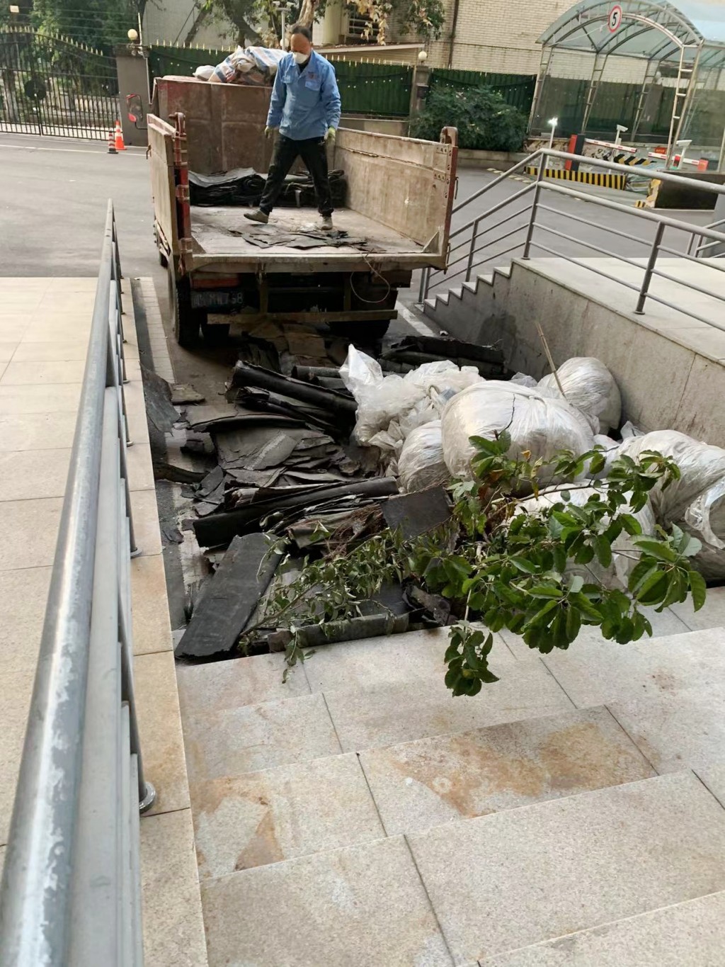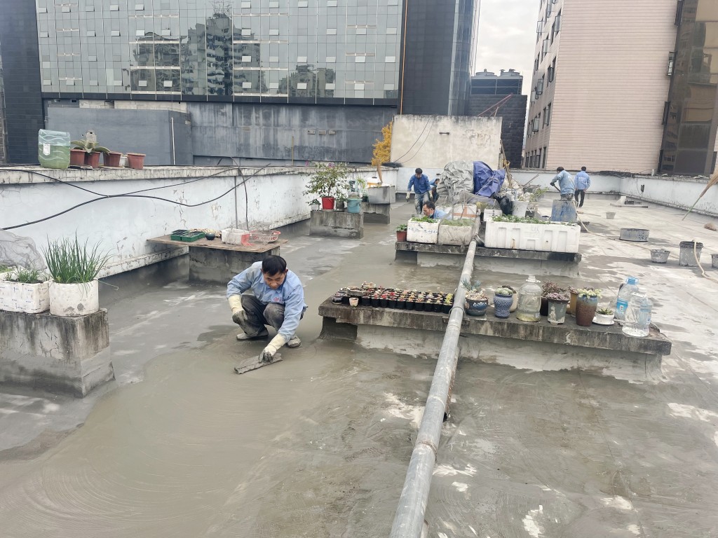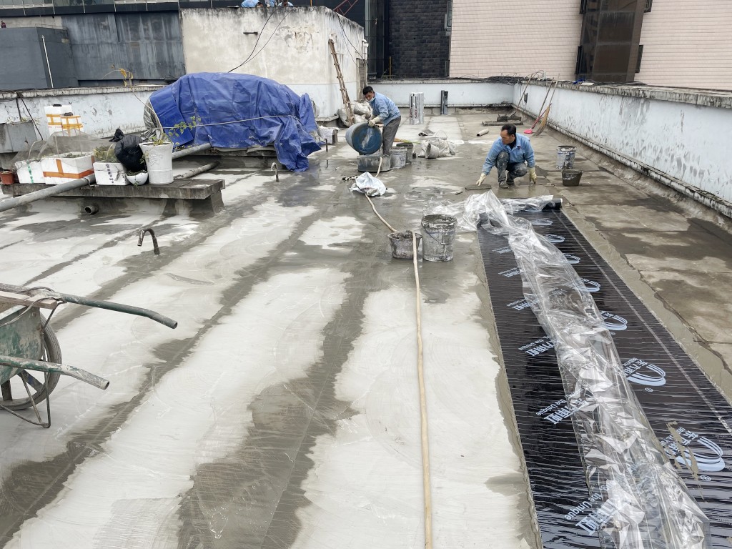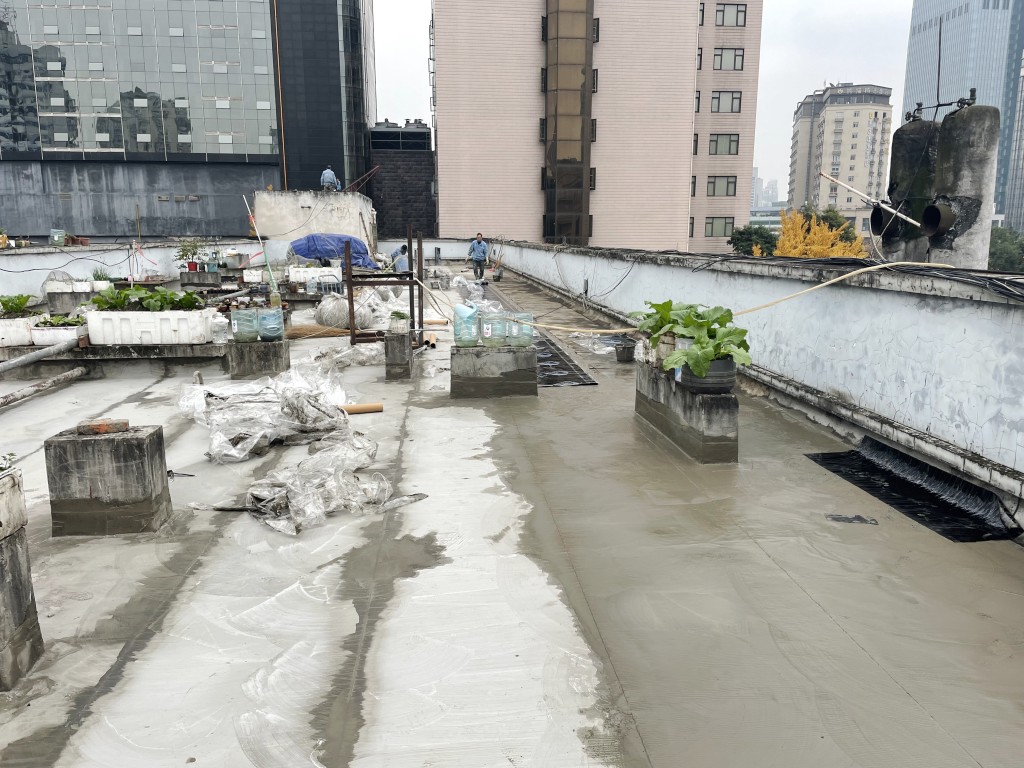我公司采取的施工方案為:先將地面原有改性瀝青防水卷材清理掉,然后在地面及墻面滿鋪一層濕鋪防水卷材(濕鋪防水卷材可避免水在防水卷材底下到處竄的情況),防水卷材施工后在表面做一層砂漿保護層蓋住防水卷材,讓防水卷材免受紫外線照射,延長防水卷材壽命,最后將施工產(chǎn)生的建渣搬運下樓并清運出場。
