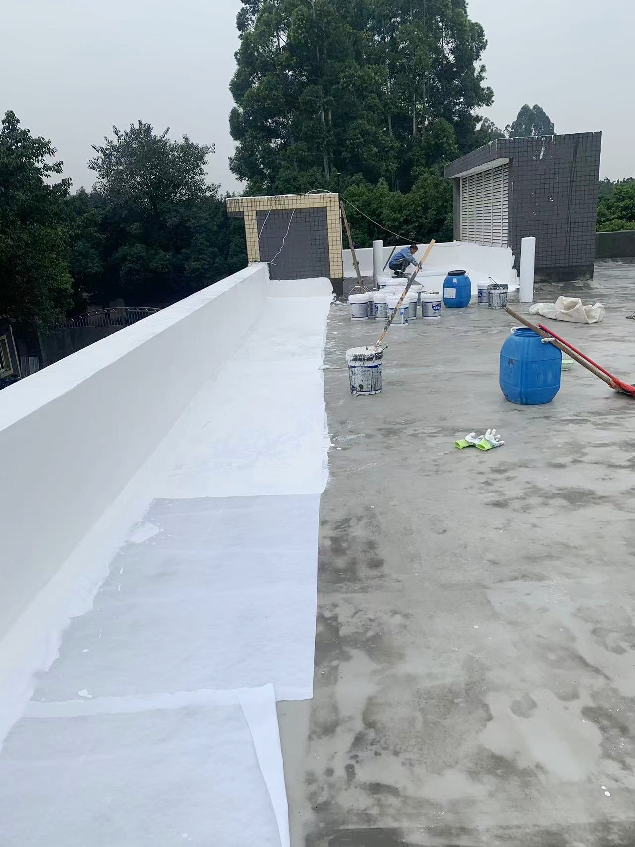 最后,待涂料干燥后,表面再滿滾涂刷(或噴涂)一道SYR金屬屋面防水涂料,形成一層外露型防水保護膜,進一步增強了防水效果。整個施工過程產生的垃圾被及時清理干凈,確保了施工現場的整潔和衛生。