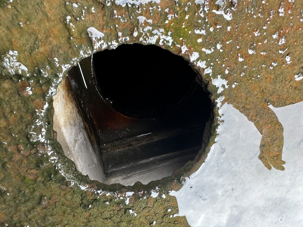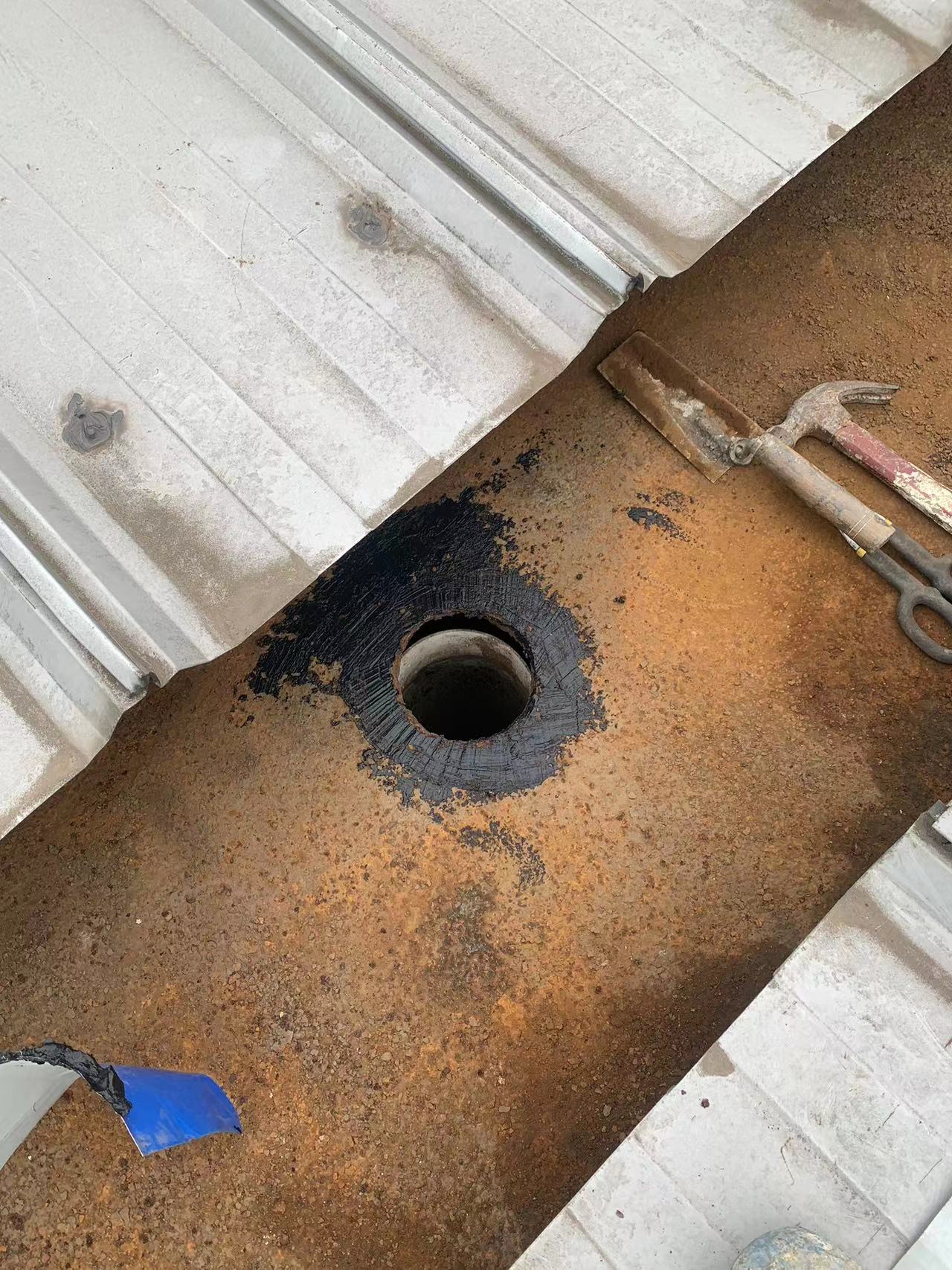該廠房的彩鋼頂天溝在長期受到酸雨侵蝕下,天溝內個別下水管口銹蝕爛掉,導致雨水在降雨時從漏斗旁滴落,造成下水管周邊漏雨。同時,天溝內部的鐵板也出現了嚴重的銹蝕現象,已經出現起殼脫層,如果不及時處理,天溝可能會銹蝕穿孔,導致漏水,對廠房的生產設備及安全生產構成威脅。