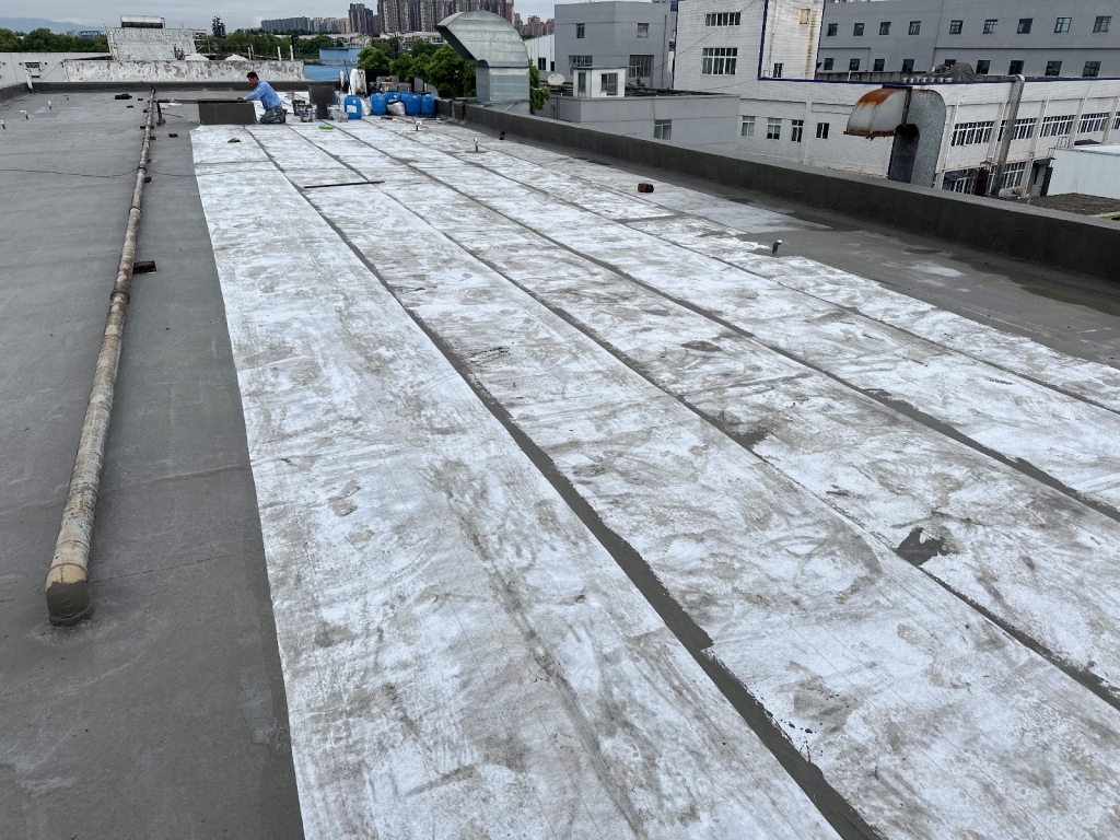 待基層干燥后,涂刷國標(biāo)一型聚合物防水涂料,并滿鋪貼專用縫織聚酯布,形成一層堅(jiān)固的防水層。