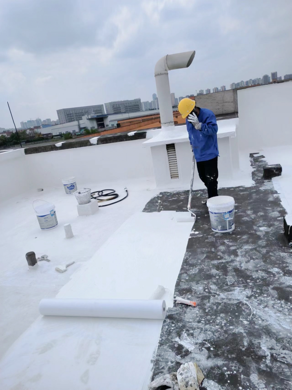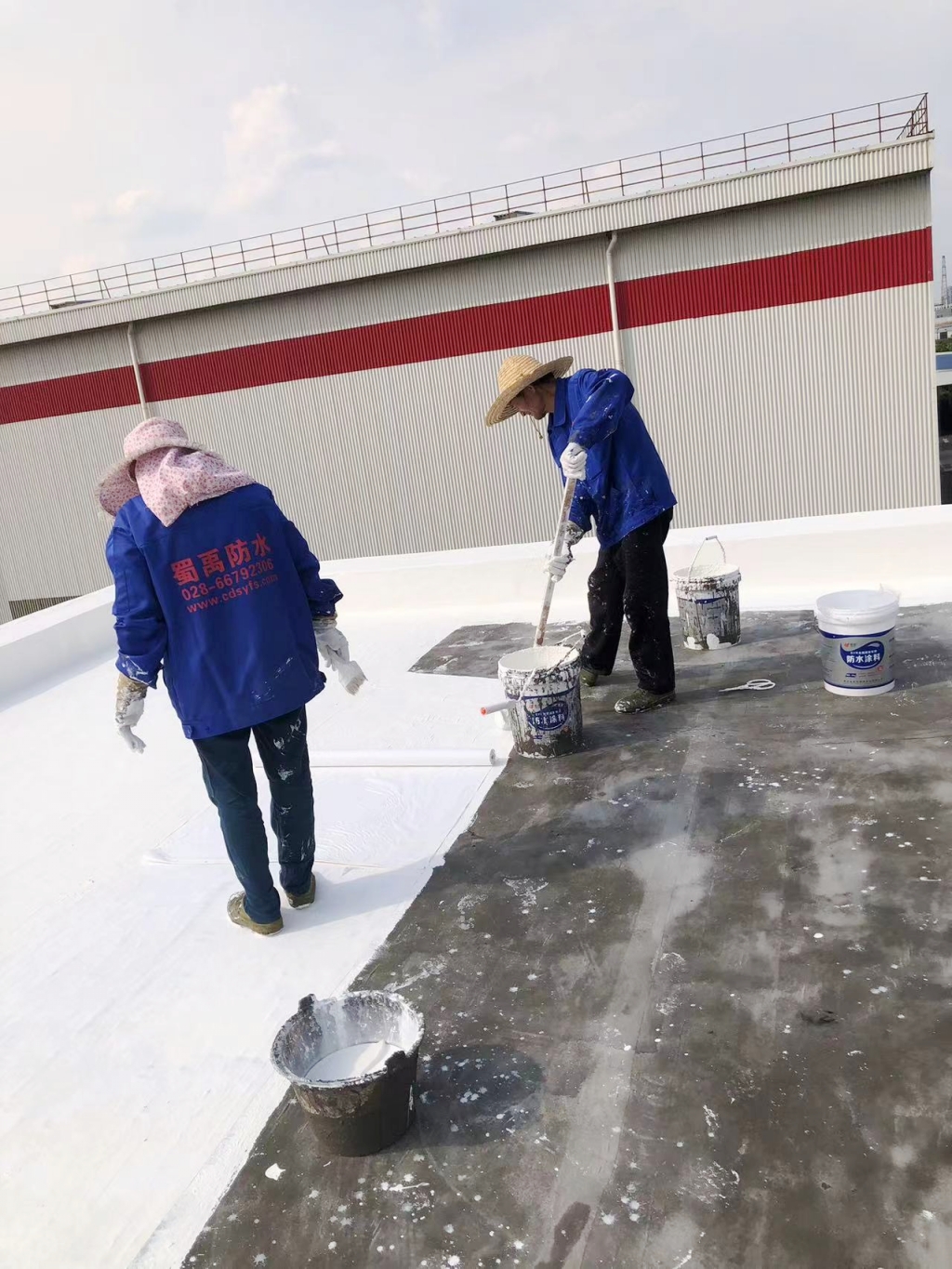 待第道一布兩涂防水涂料干燥后,我們涂刷SYR金屬屋面防水涂料,并再次鋪貼專用縫織聚酯布,表面再涂刷SYR金屬屋面防水涂料。這一材料的選用,不僅進(jìn)一步提升了防水性能,同時也賦予了屋頂表面優(yōu)異的反射隔熱效果。在涂刷完第二層SYR金屬屋面防水涂料后,我們靜待其干燥,隨后又涂刷了一層,確保防水系統(tǒng)達(dá)到更佳效果。