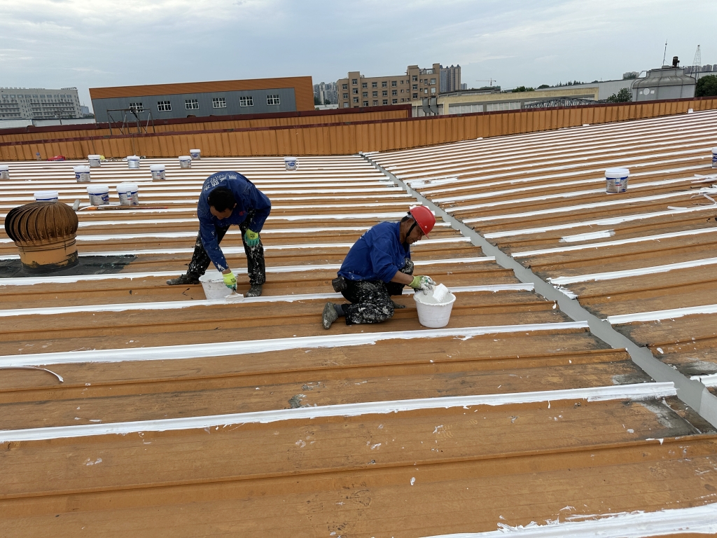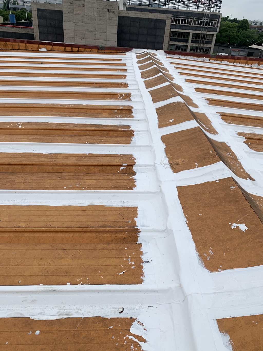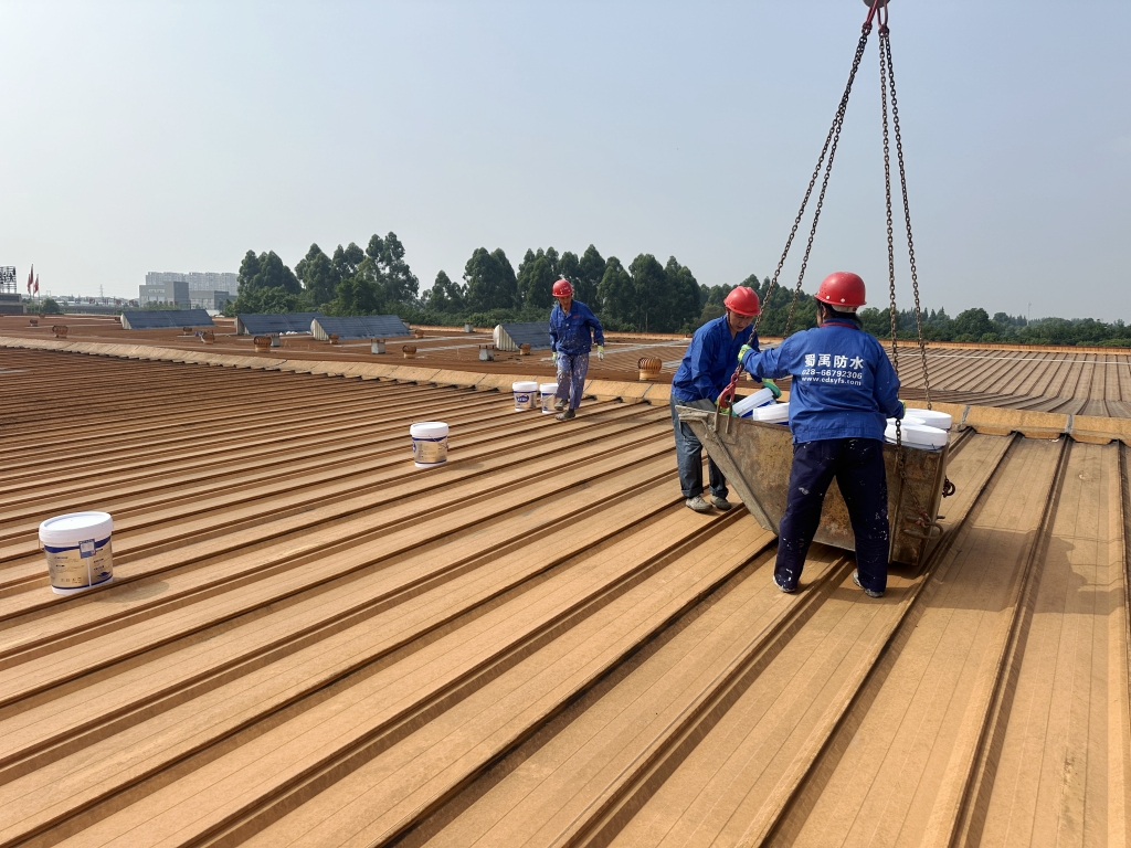 針對(duì)這一復(fù)雜情況,成都蜀禹制定了科學(xué)周密的防水施工方案。我們選用了SYR金屬屋面專(zhuān)用防水涂料,該涂料具有優(yōu)異的耐候性、粘結(jié)力和彈性,能夠有效抵御因金屬熱脹冷縮產(chǎn)生的應(yīng)力變化,確保防水層的持久穩(wěn)定。同時(shí),結(jié)合縫織聚酯布進(jìn)行“一布三涂”的施工工藝,即先在縫隙處鋪設(shè)一層縫織聚酯布以增強(qiáng)防水層的抗拉強(qiáng)度,再在其上涂刷三層防水涂料,形成一道堅(jiān)不可摧的防水屏障。