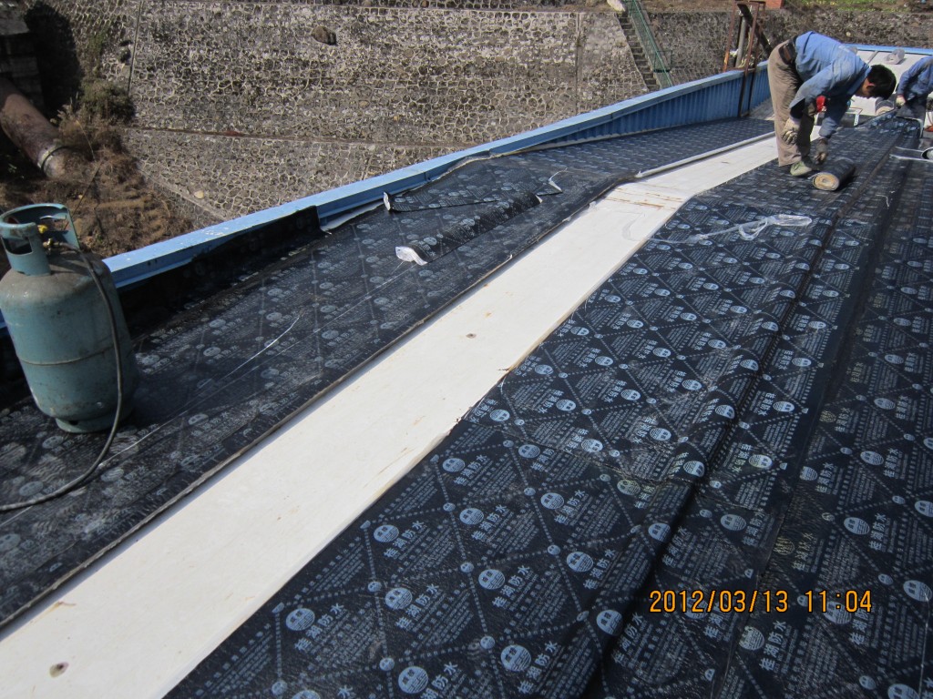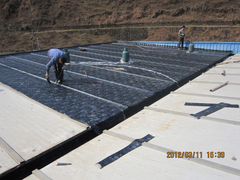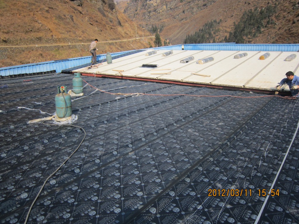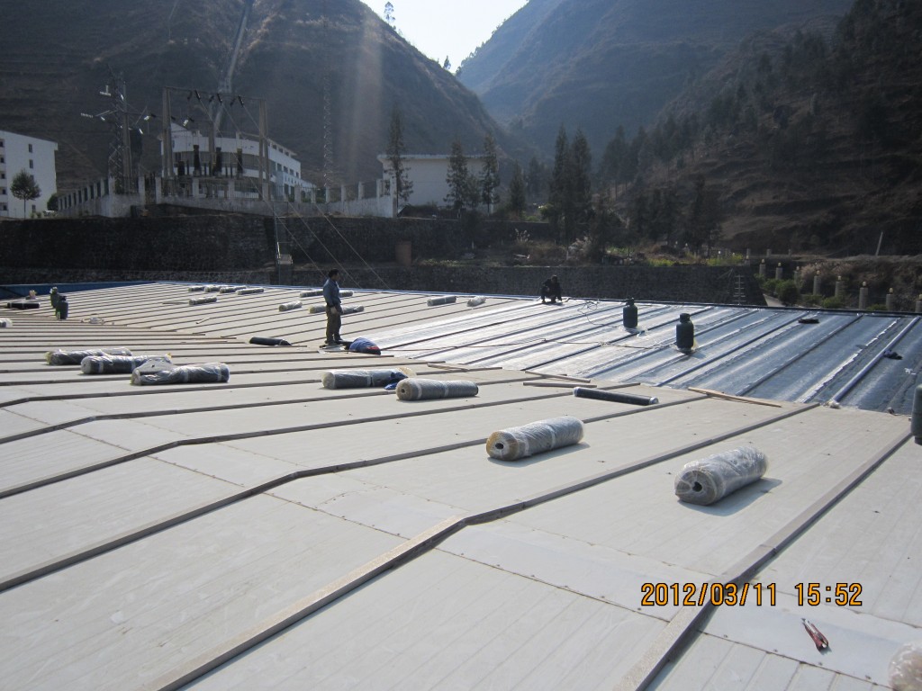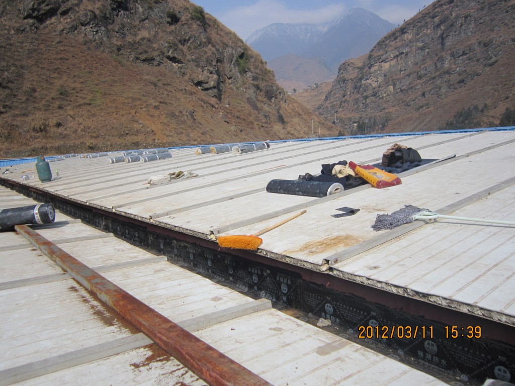 甘洛縣吉日波水電站位于四川省涼山彝族自治州甘洛縣境內,吉日波水電站的車間頂部采用彩鋼頂修建,車間經過一些年代后陸續出現多處漏水,期間經過多次小修小補效果均不理想,甘洛縣吉日波水電站于2012年2月找到本公司業務員,本公司派人前往查看現場后,最終采取的方案是在彩鋼瓦頂不全做一層4mm玻纖胎SBS改性瀝青防水卷材,本公公司于2012年3月10日開始施工,施工后效果非常好,截至今年前段時間的回訪,吉日波水電站車間彩鋼頂的防水效果依然非常好。